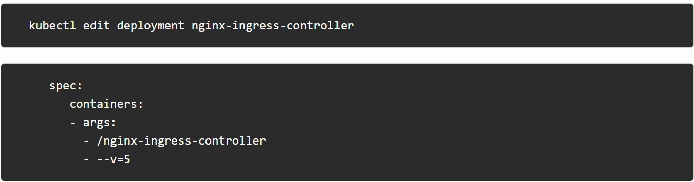 您可以通过添加  到  Kubernetes 部署的部分来将日志级别更改为 调试。请注意,必须使用 NGINX 部署构建 - 以便稍后获得调试日志。–v=5-args-with-debug