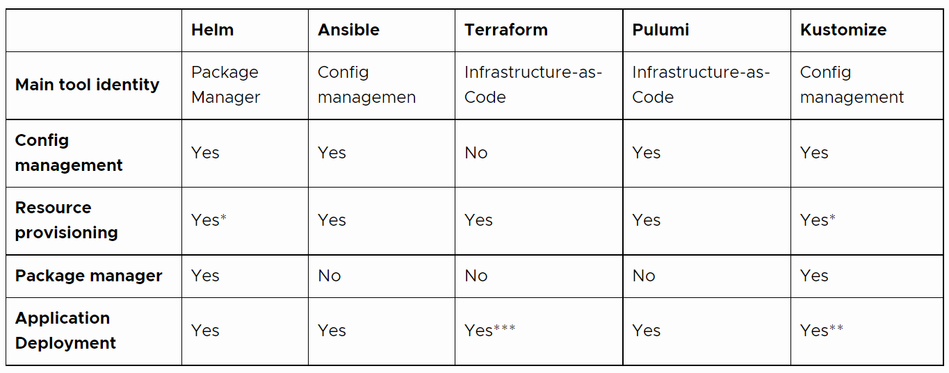 (* in combination with CrossPlane, Helm and Kustomize can provision cloud resources ** kubectl apply -k (docs) *** when you provision K8S resources with terraform provider is actually deploy
