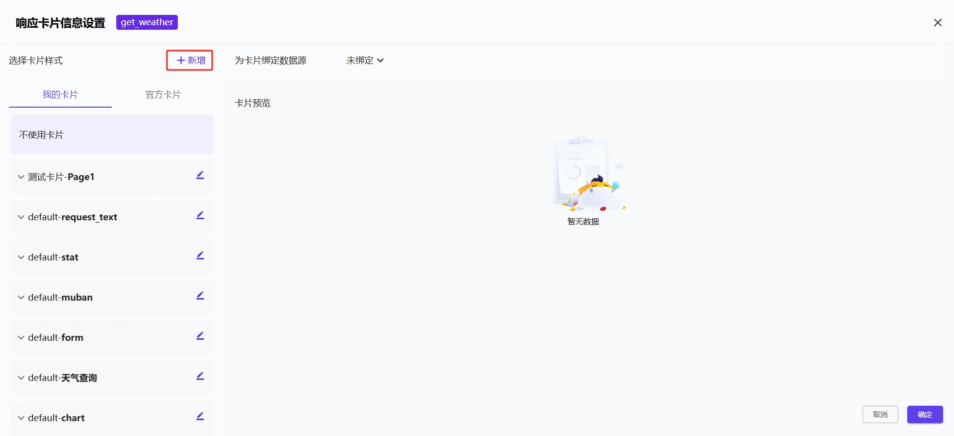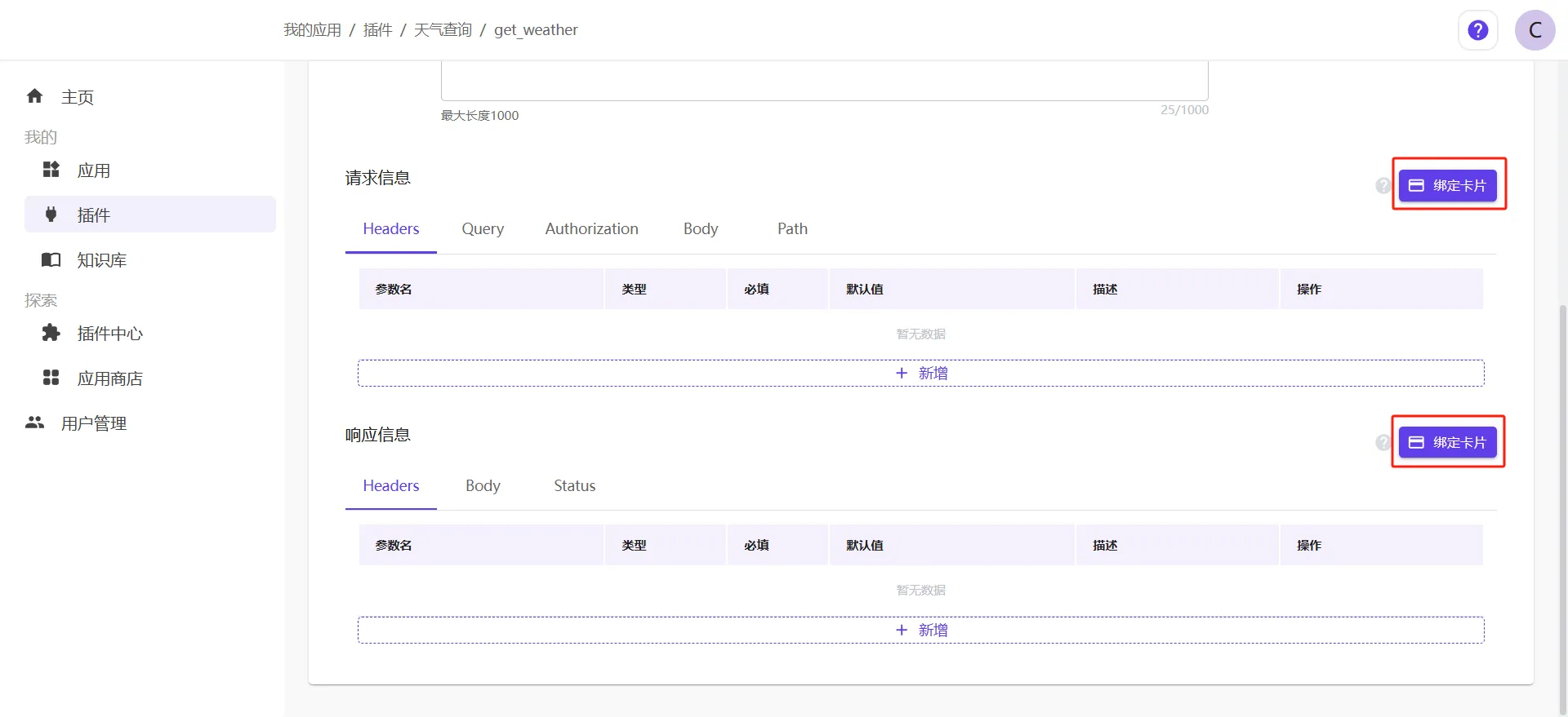 首先需要在“插件—技能”内绑定一个卡片应用。例,点击:我的-->插件—“天气查询”-->编辑技能-->请求信息/响应信息-->绑定卡片。